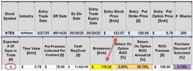 Cash-secured put trades can be crafted conservatively by using deep out-of-the-money (OTM) strikes. On 5/27/2025, I executed such a 4-day trade with NetEase Inc. (Nasdaq: NTES), a stock on our premium member watch list at the time. This article will analyze the reasons for trade entries, strike selection and final trade results.