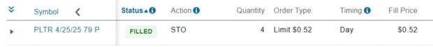 - 4/23/2025: STO 4 x 4/25/2025 $98.00 puts at $0.33 for an additional net credit of $124.00 ($31.00 x 4)