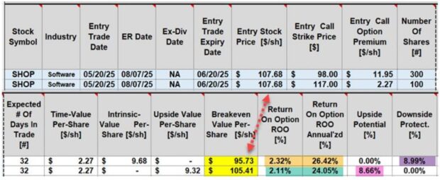 - The ITM $98.00 strike (3 contracts) has a 32-day initial time-value return of 2.32%, 26.42% annualized (brown cells)