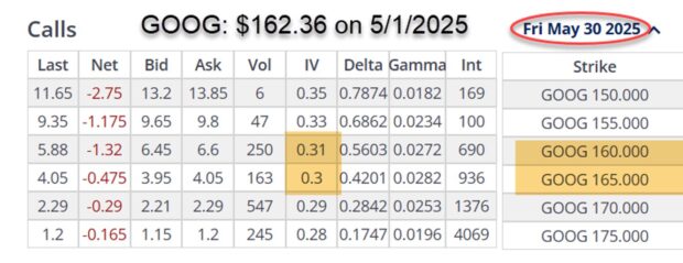 Real-life example with Alphabet, Inc. (Nasdaq: GOOG): Call Option-Chain on 5/1/2025