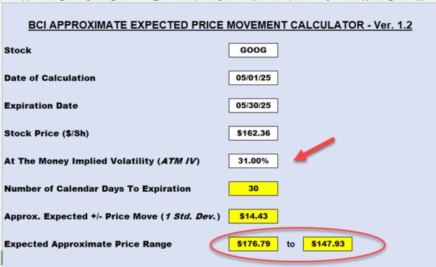 - After entering the ATM IV (31%), the spreadsheet projects a trading range of $147.93 to $176.79 during the 30-days of this contract