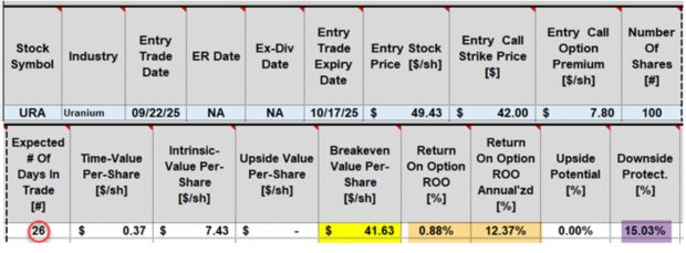 On 9/22/2025, URA, an exchange-traded fund, was trading at $49.43. Since this is a high IV ETF, we can opt for ITM covered calls where the intrinsic-value component of the premium will create greater protection to the downside. We also want to confirm that these defensive trades will still generate adequate returns to justify the trades.